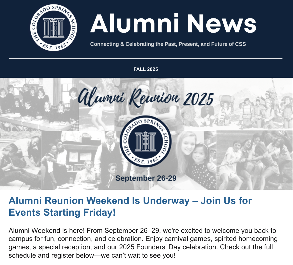 Greetings, CSS Alumn! We’re thrilled to welcome you back to campus to celebrate and connect! Join fellow alumni, along with current CSS families, faculty, and staff, for a lineup of exciting events. Bring your family, reconnect with friends, and make new memories at CSS. Please view the schedule below and RSVP here.