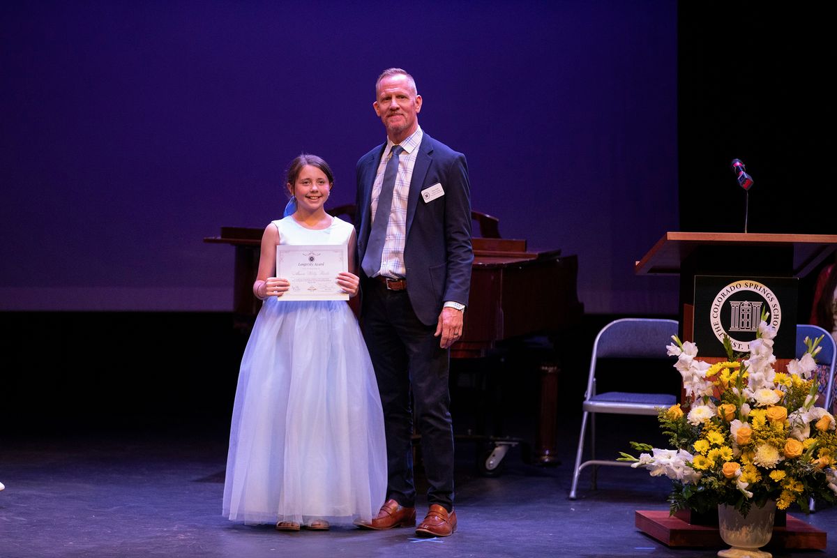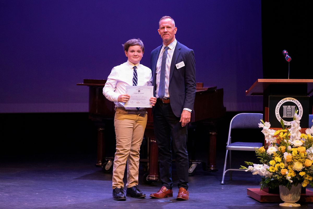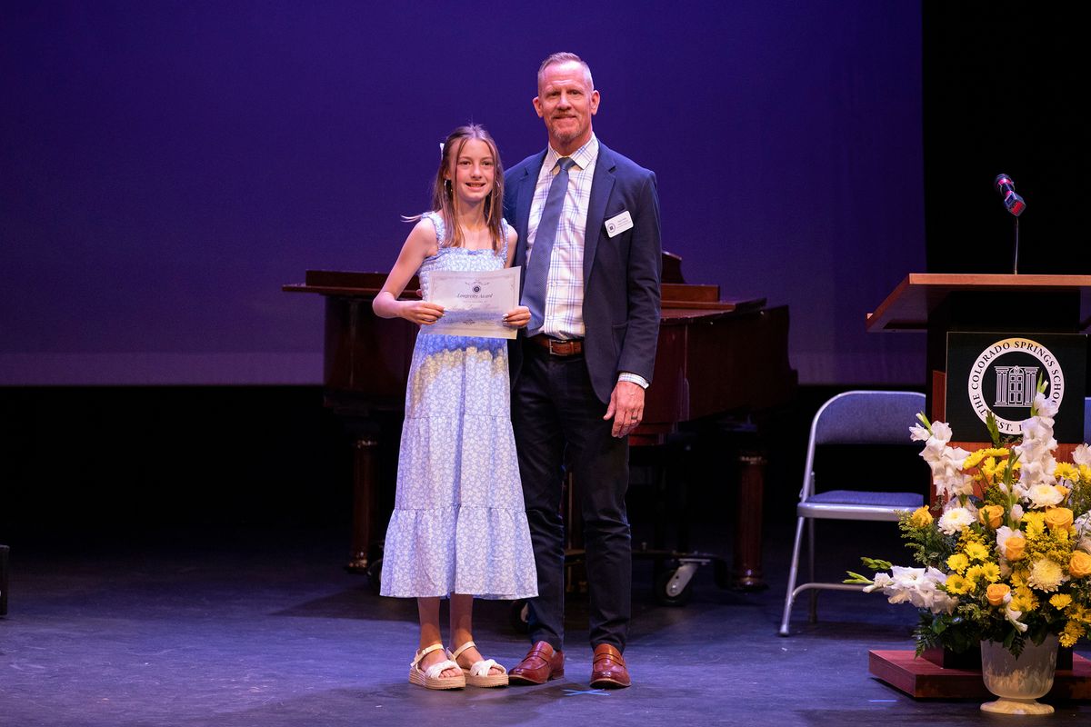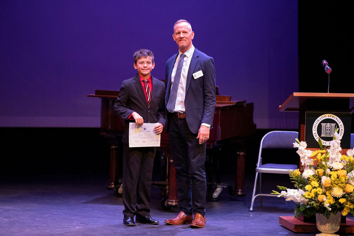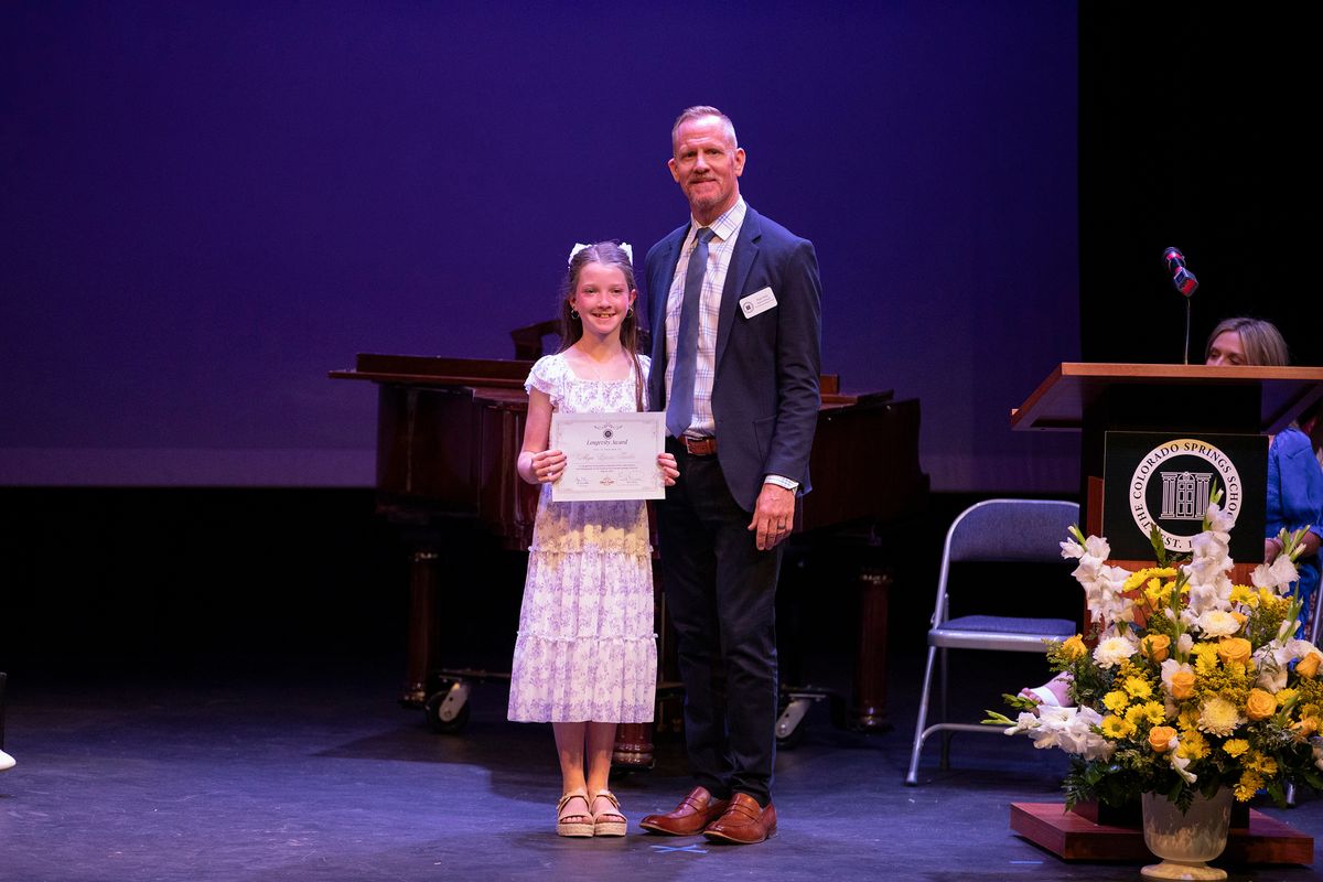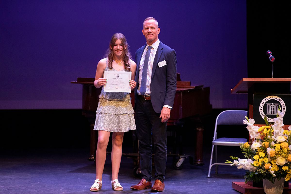 The 5th Grade Choir with accompanist Mia V. '28 performed the Alma Mater. Head of School Ryan Kelly presented the following students with Longevity Awards for having attended CSS continuously since Kindergarten or earlier: Mayla B., Adithya E., Kaitlyn F., Sophia G., Liam H., Noah M., Leo P., Logan R., Maeve R., and Mya T.