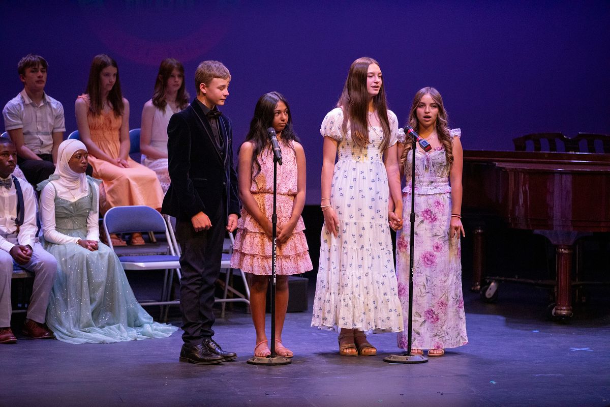 Eighth-grade choir members Noah H., Sachi K., Elena M., and Emilia T. performed "Rewrite the Stars" from The Greatest Showman.