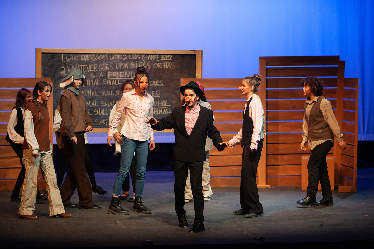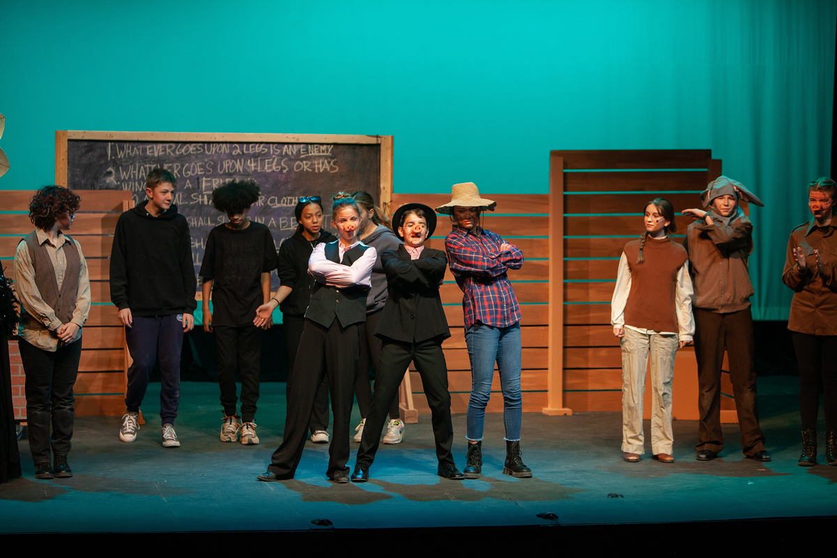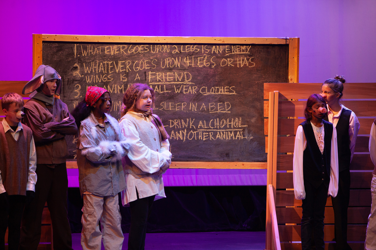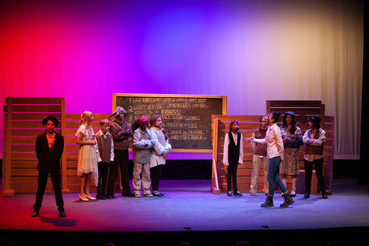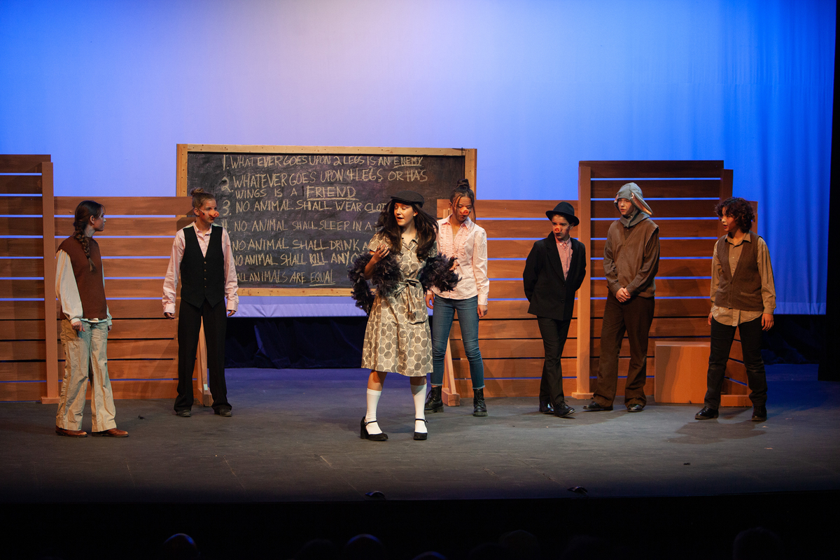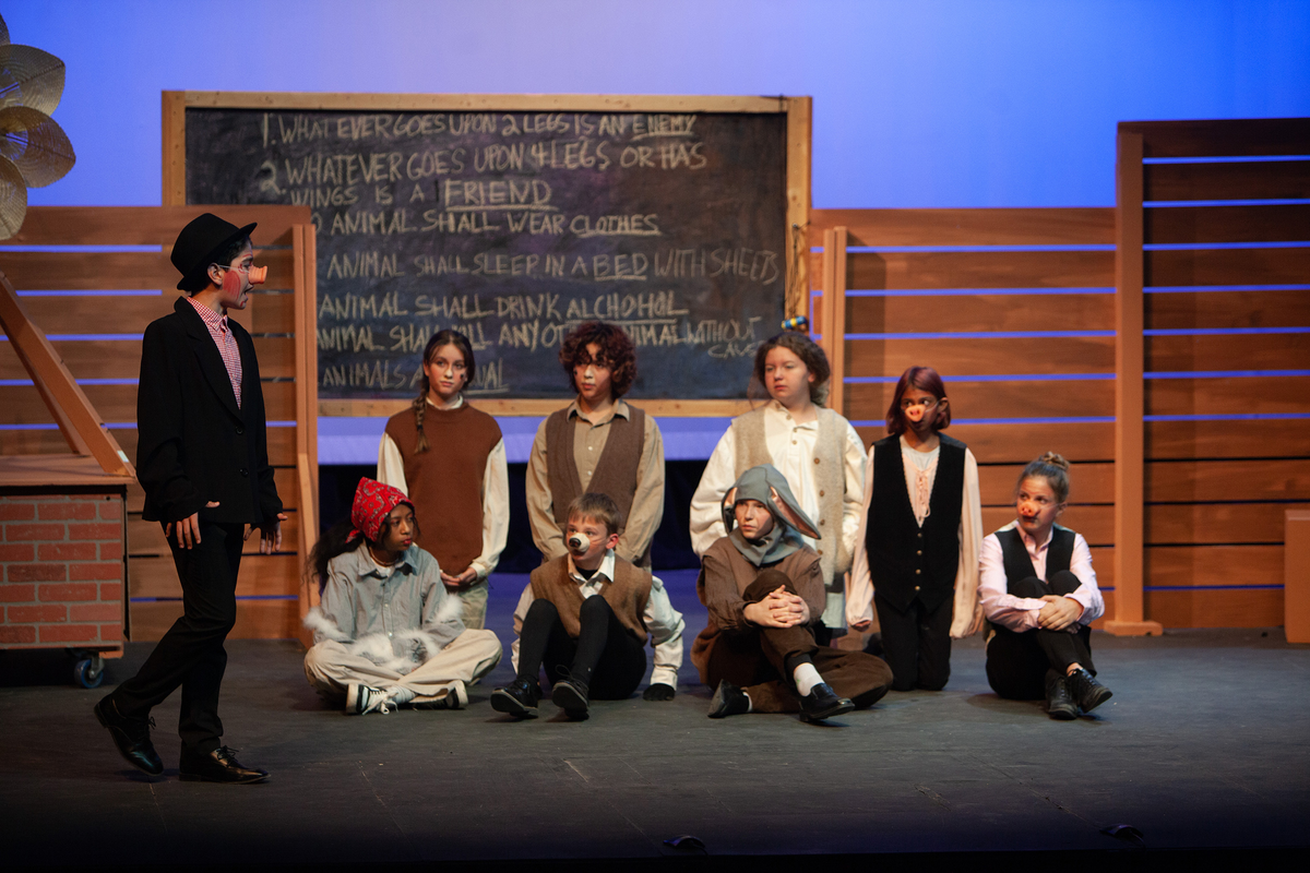Congratulations to the Middle School cast and crew of George Orwell's Animal Farm for delivering an outstanding performance on Friday, December 1, 2023, in the Louisa Performing Arts Center. This student-driven play was a culmination of theatre arts class. Adapted by Ian Wooldridge, the play depicts a group of animals who rebel against humans and become their own masters. Things work smoothly at first, and the animals revel in their freedom and equality. However, the pigs become power-hungry and become the new oppressors of the animals and become indistinguishable from humans.