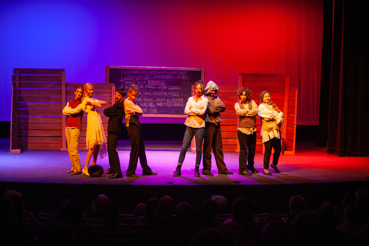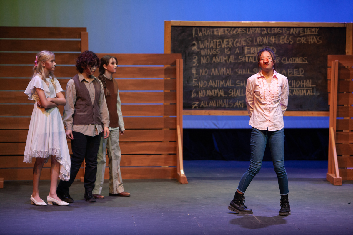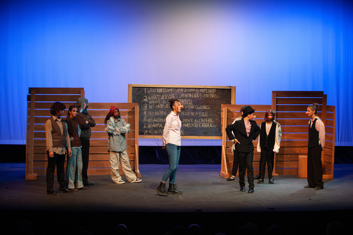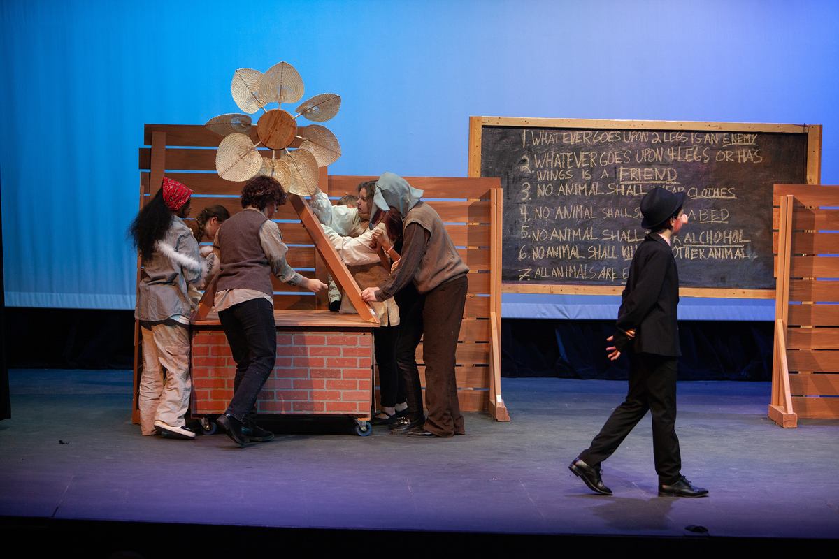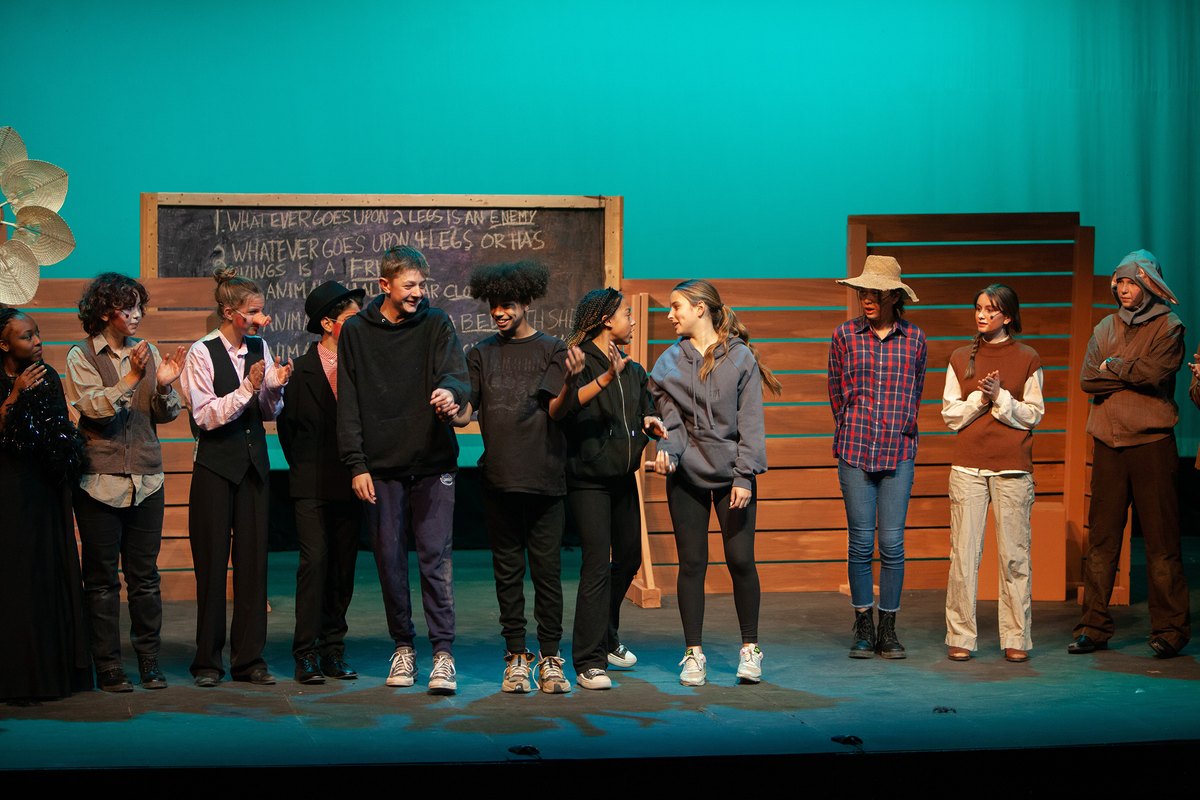Congratulations to the Middle School cast and crew of George Orwell's Animal Farm for delivering an outstanding performance on Friday, December 1, 2023, in the Louisa Performing Arts Center. This student-driven play was a culmination of theatre arts class. Adapted by Ian Wooldridge, the play depicts a group of animals who rebel against humans and become their own masters. Things work smoothly at first, and the animals revel in their freedom and equality. However, the pigs become power-hungry and become the new oppressors of the animals and become indistinguishable from humans.