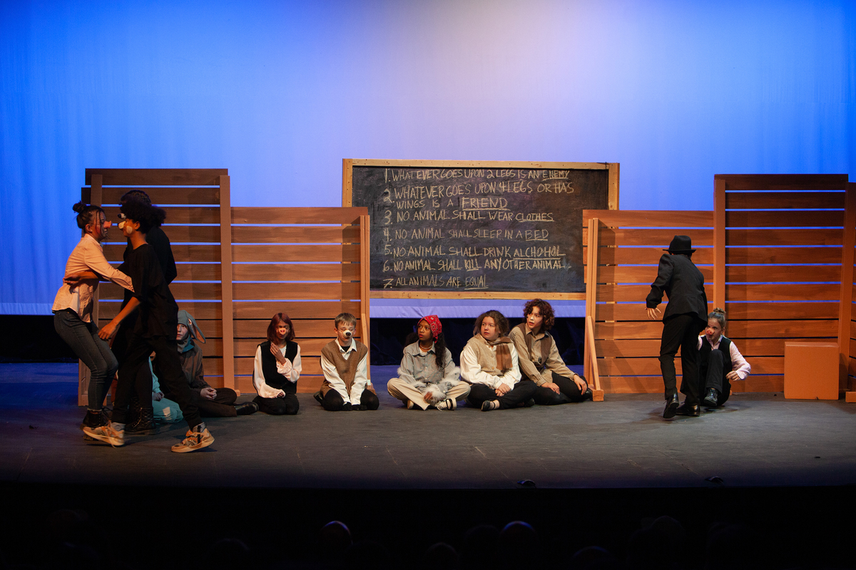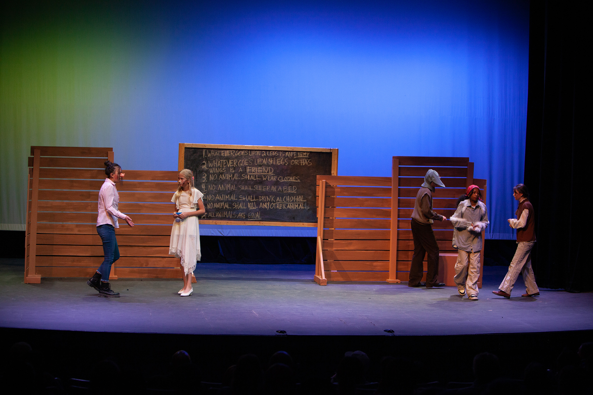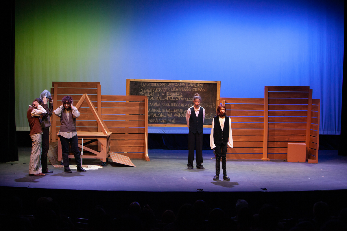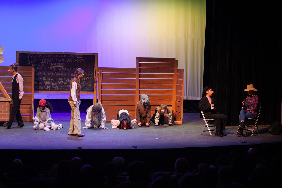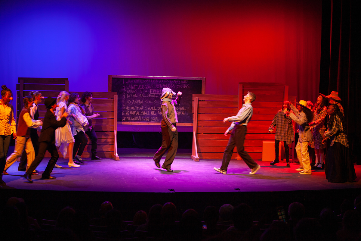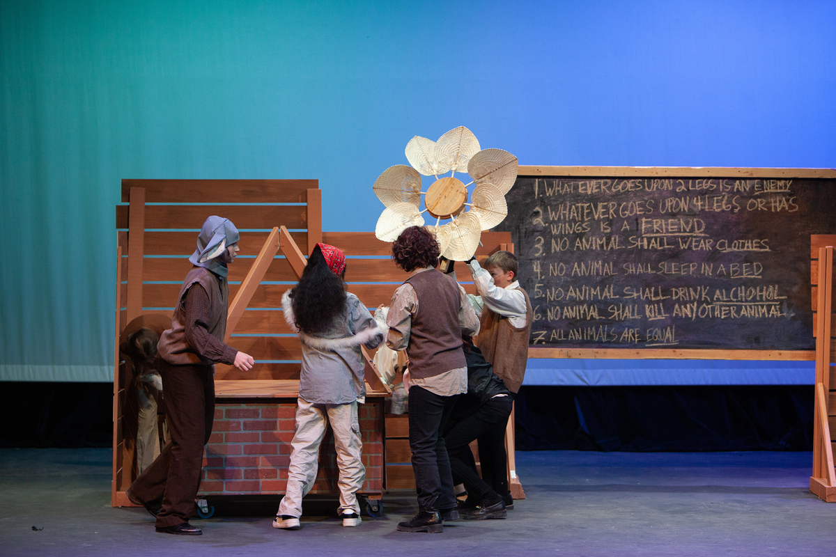 Congratulations to the Middle School cast and crew of George Orwell's Animal Farm for delivering an outstanding performance on Friday, December 1, 2023, in the Louisa Performing Arts Center. This student-driven play was a culmination of theatre arts class. Adapted by Ian Wooldridge, the play depicts a group of animals who rebel against humans and become their own masters. Things work smoothly at first, and the animals revel in their freedom and equality. However, the pigs become power-hungry and become the new oppressors of the animals and become indistinguishable from humans.