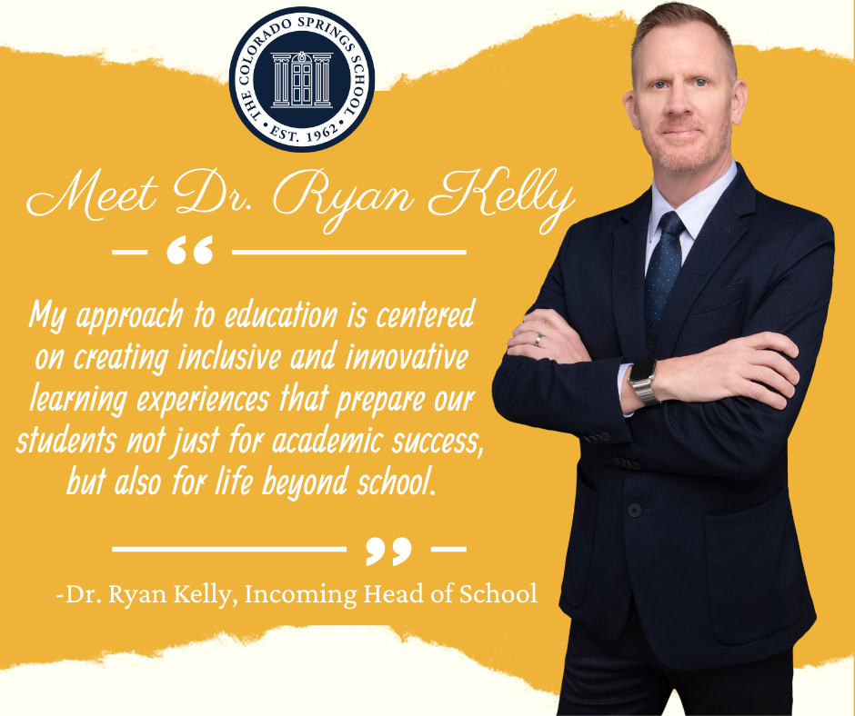 It is my honor and pleasure on behalf of The Colorado Springs School Board of Trustees to announce the unanimous appointment of Dr. Ryan Kelly as the next Head of School, commencing July 2024.