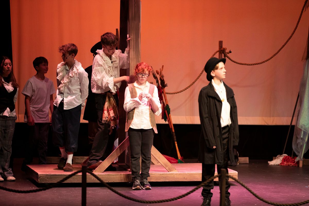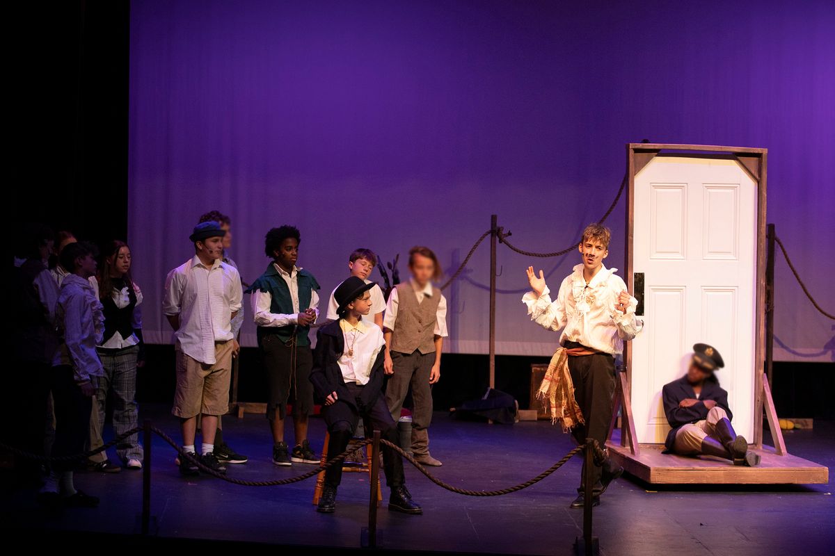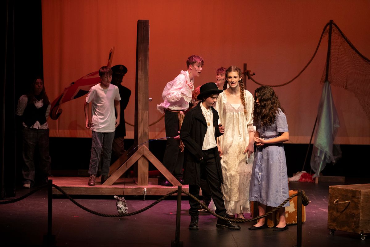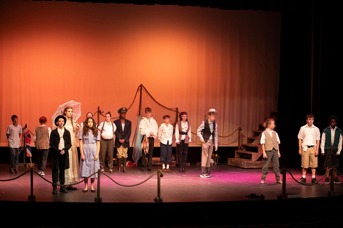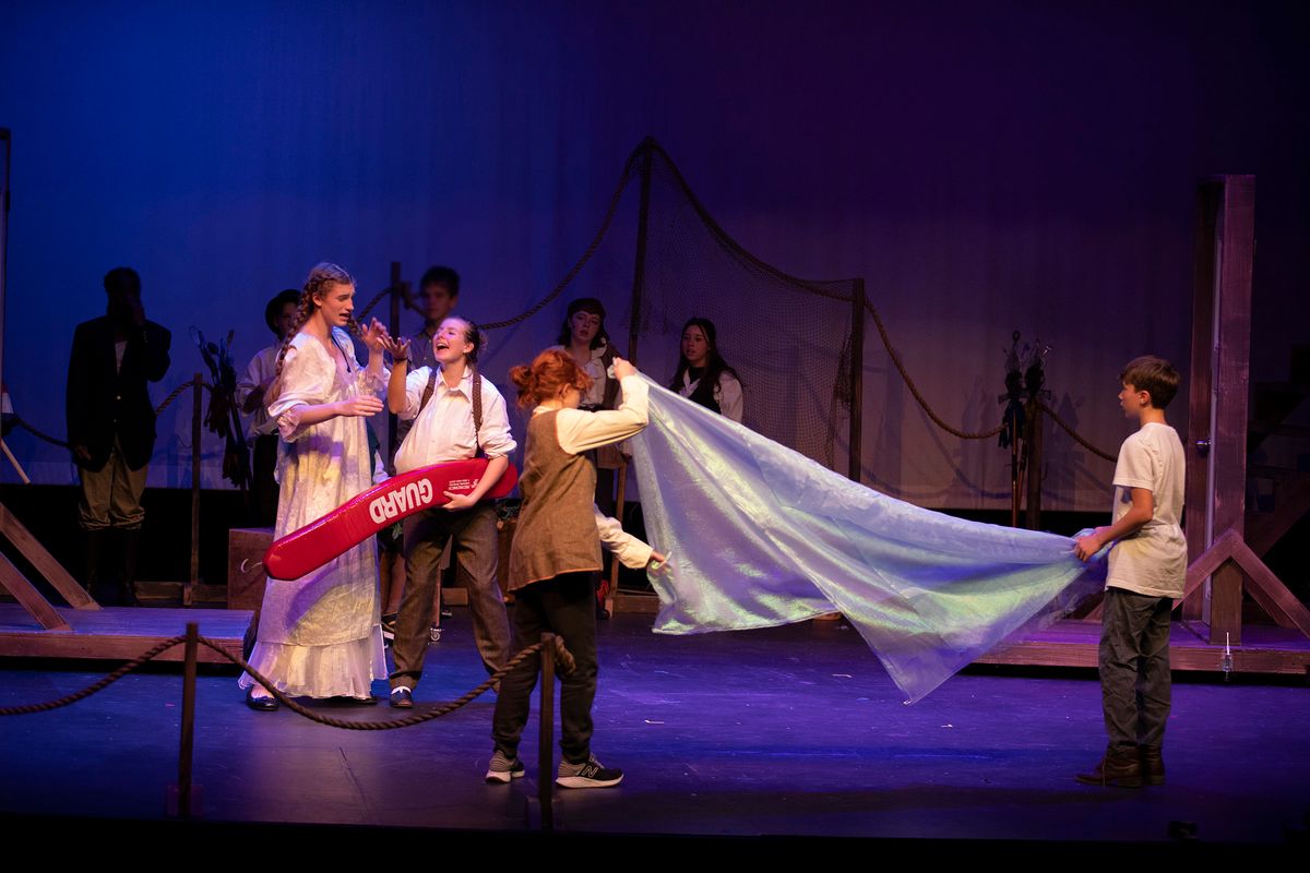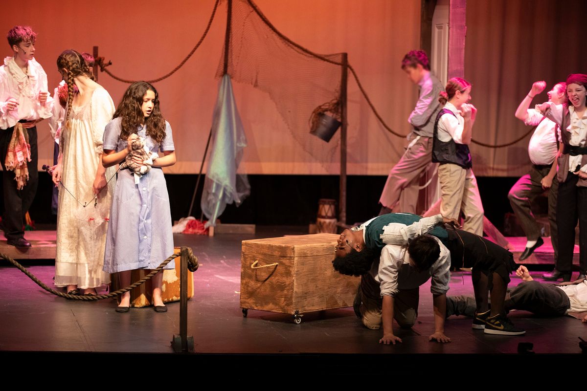 Peter and the Starcatcher, adapted by Rick Elice from the novel by Dave Barry and Ridley Pearson, is a Tony Award–winning play that reimagines the origin story of Peter Pan. The Middle School production followed a nameless orphan boy aboard the ship The Neverland, where he and his fellow orphans encountered pirates—including the comical Black Stache, who will one day become Captain Hook—and a young apprentice Starcatcher named Molly, who guarded a trunk of magical “starstuff.”