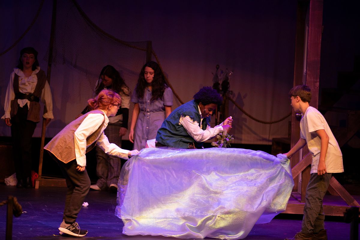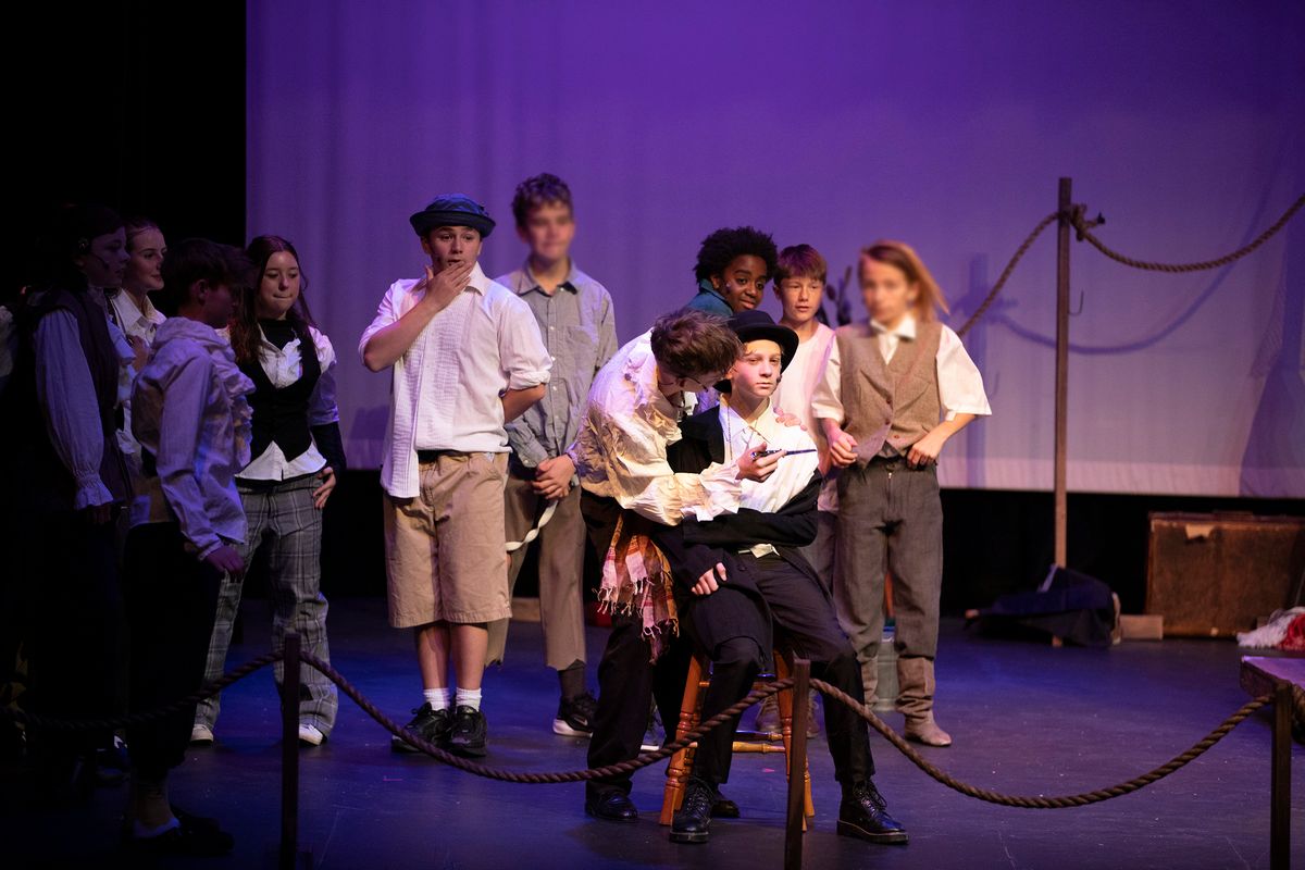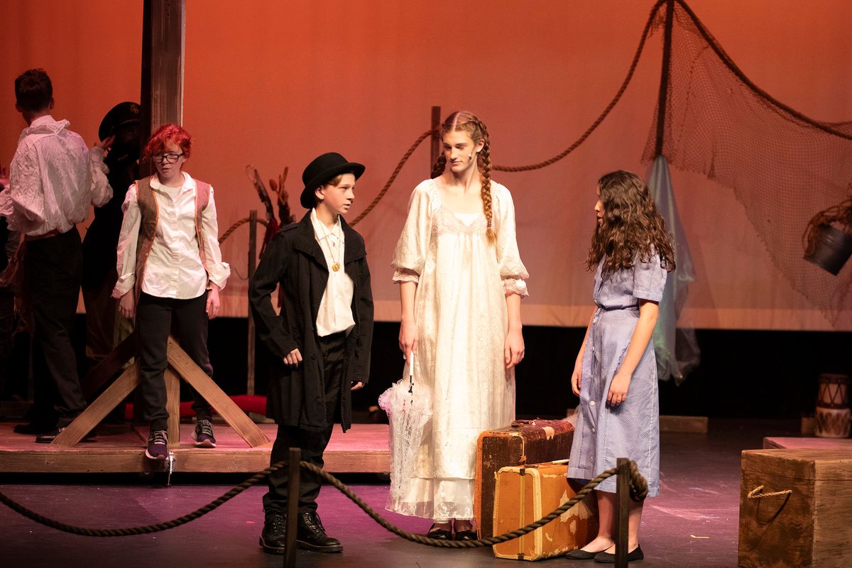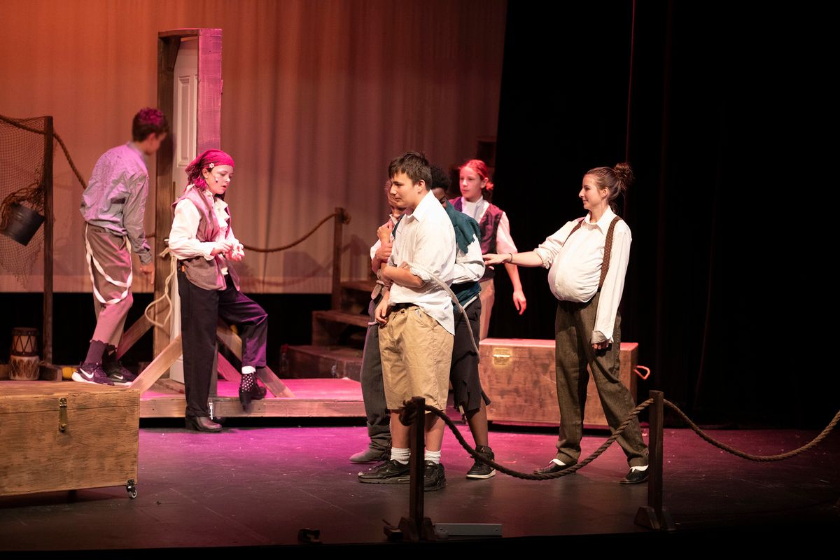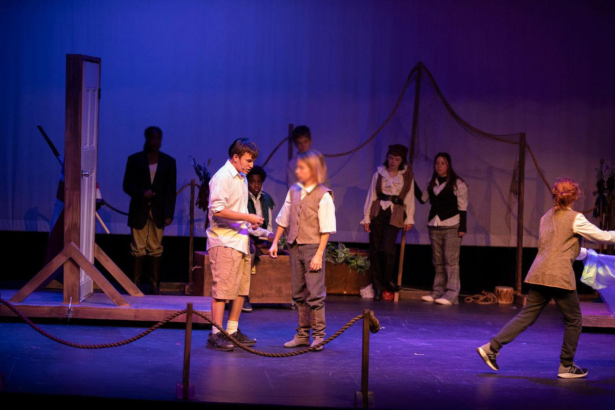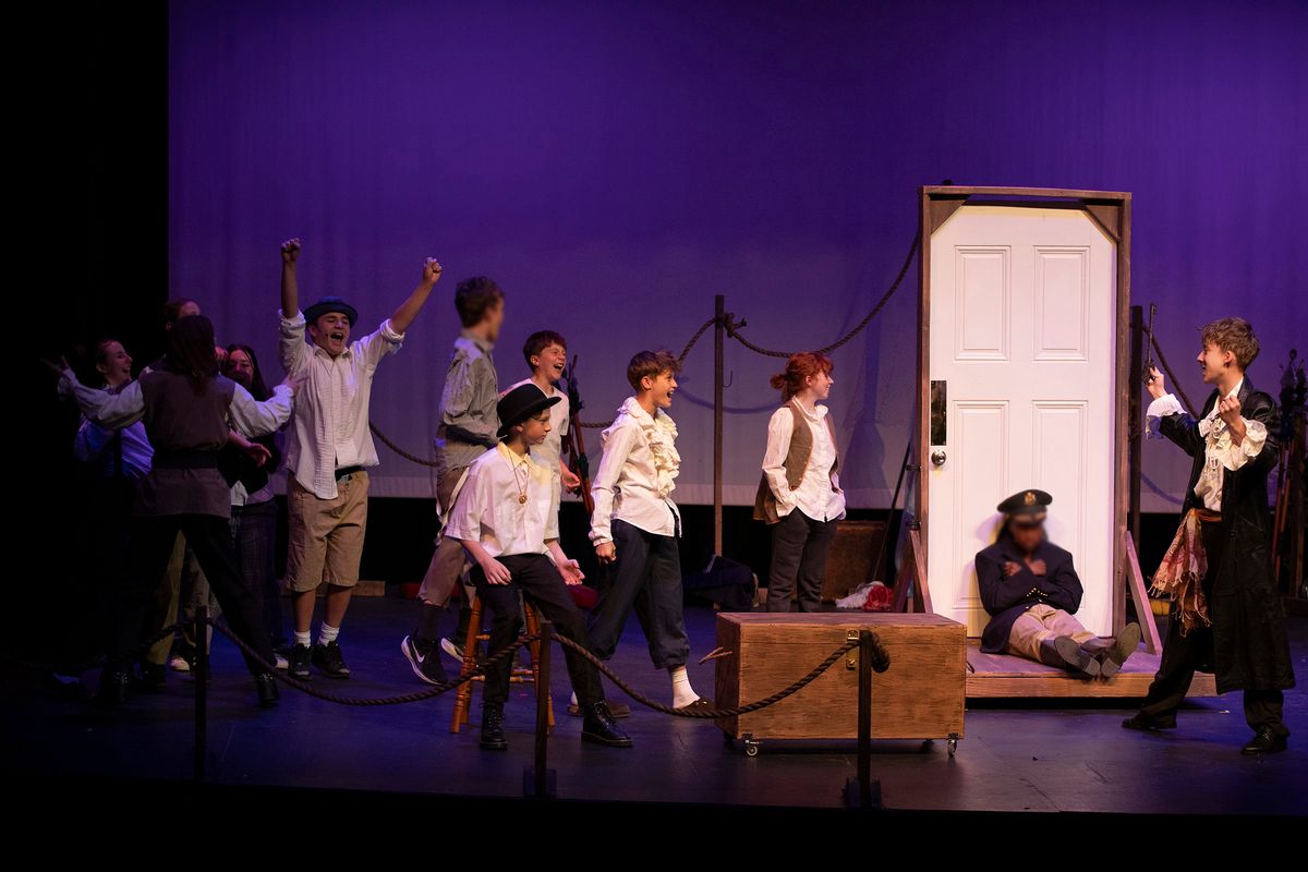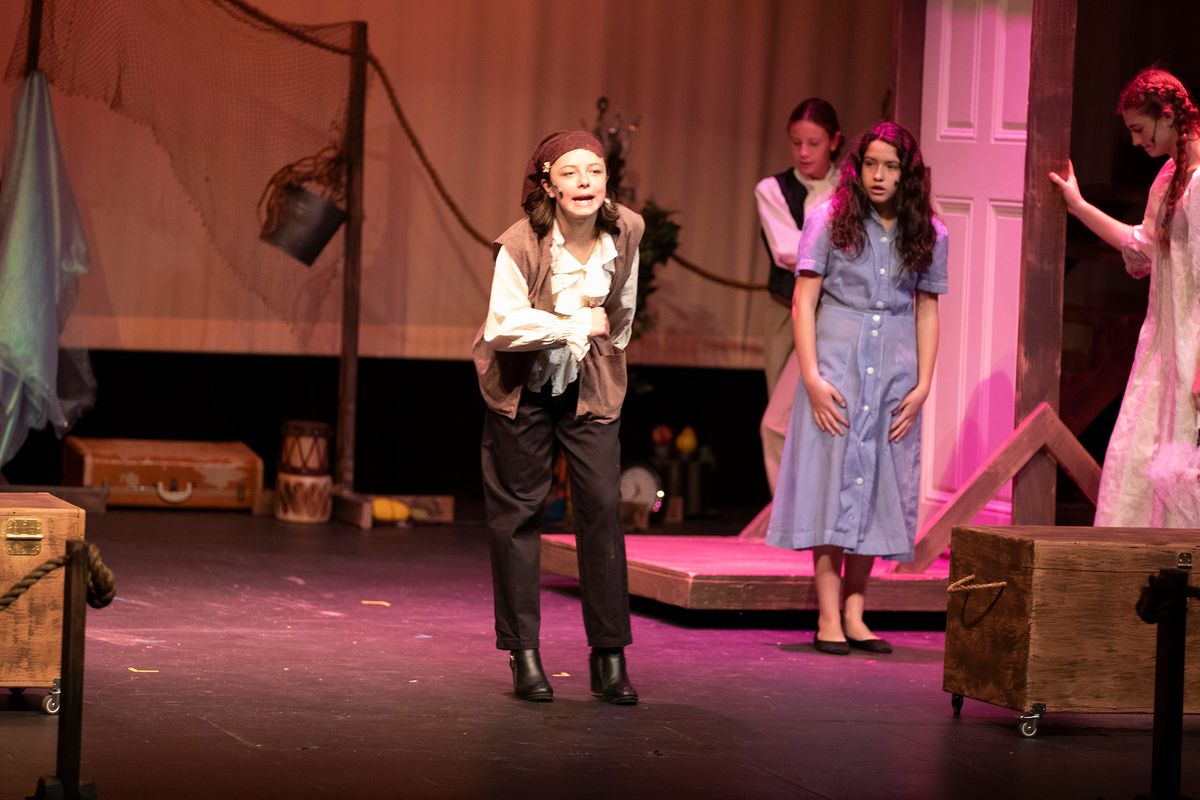 Peter and the Starcatcher, adapted by Rick Elice from the novel by Dave Barry and Ridley Pearson, is a Tony Award–winning play that reimagines the origin story of Peter Pan. The Middle School production followed a nameless orphan boy aboard the ship The Neverland, where he and his fellow orphans encountered pirates—including the comical Black Stache, who will one day become Captain Hook—and a young apprentice Starcatcher named Molly, who guarded a trunk of magical “starstuff.”