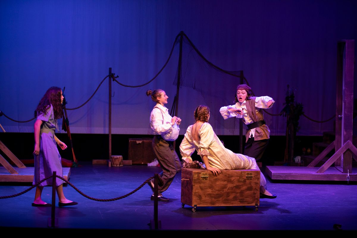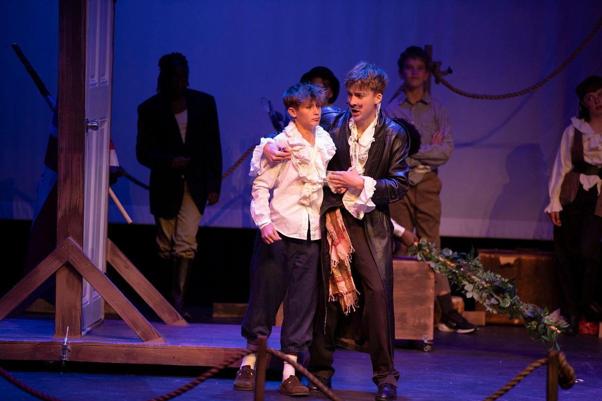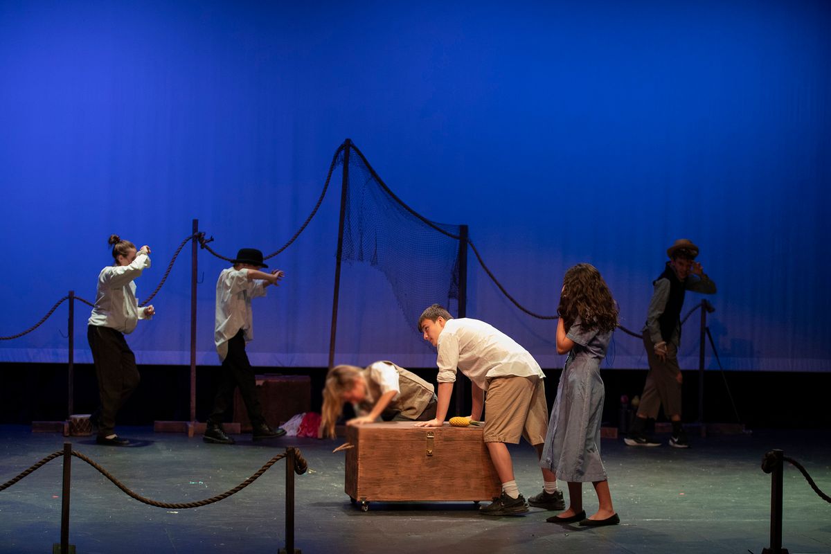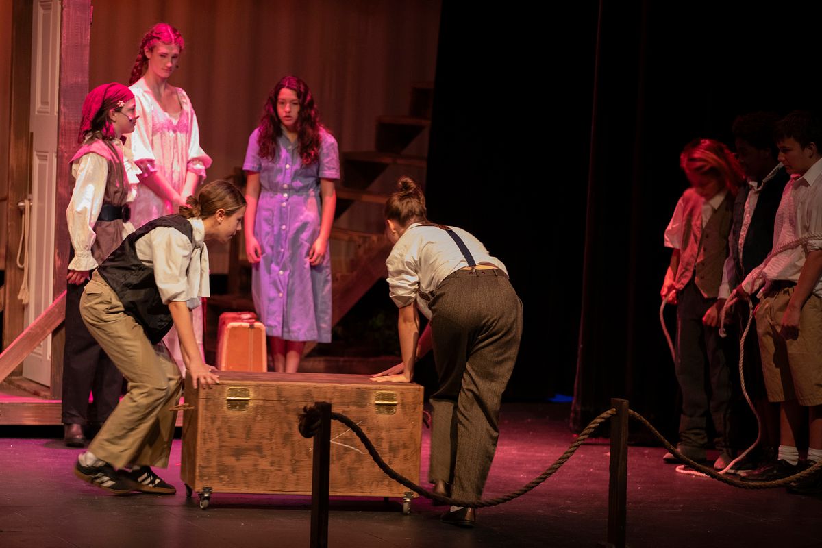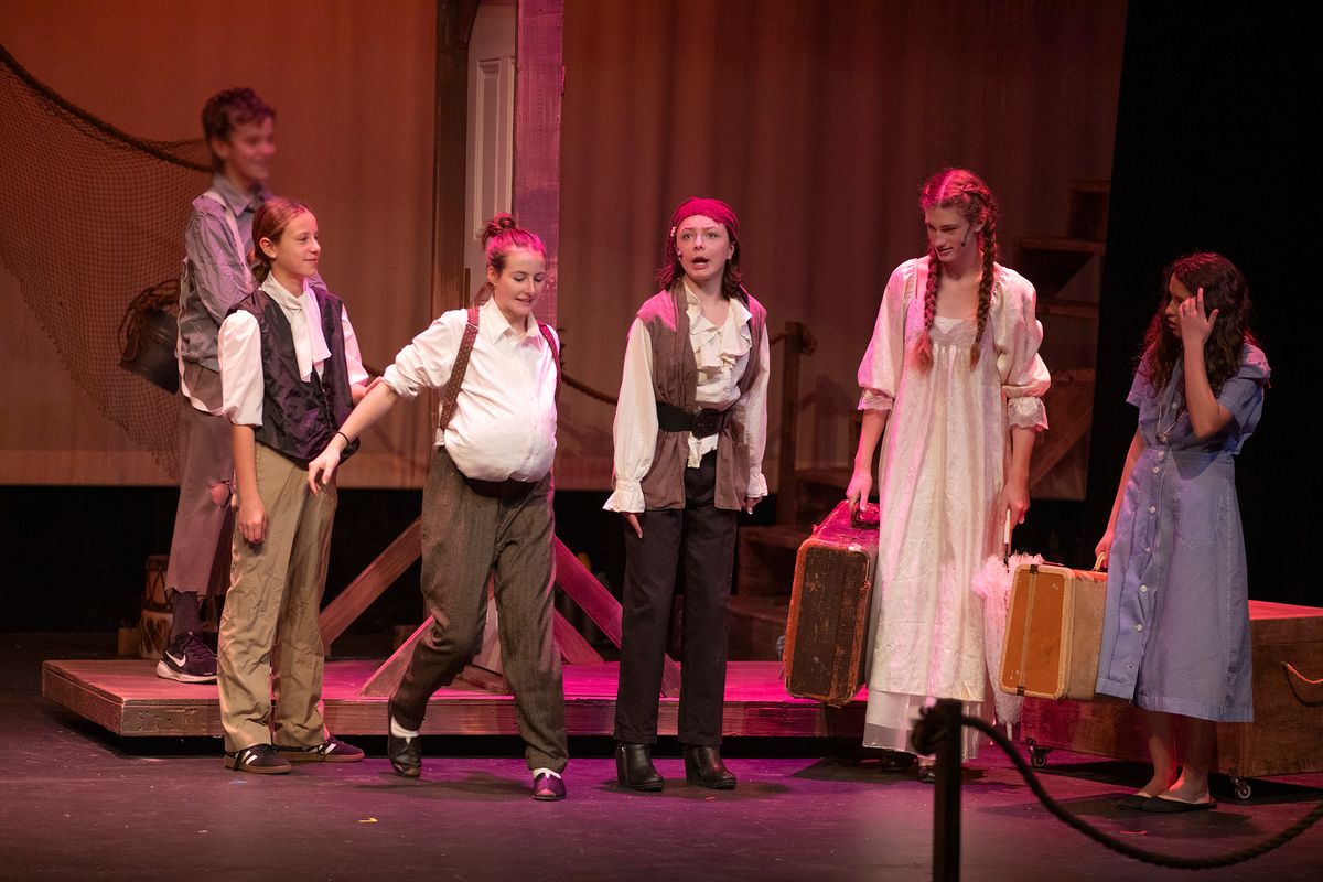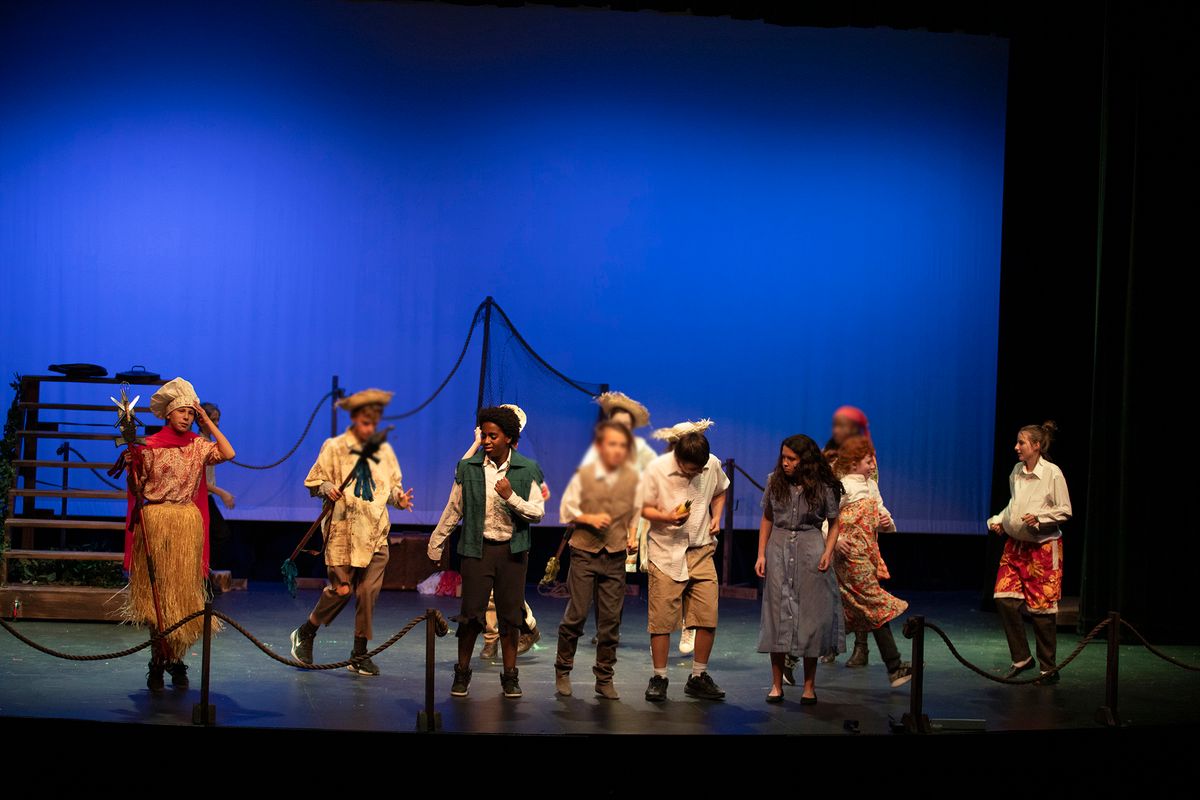 Peter and the Starcatcher, adapted by Rick Elice from the novel by Dave Barry and Ridley Pearson, is a Tony Award–winning play that reimagines the origin story of Peter Pan. The Middle School production followed a nameless orphan boy aboard the ship The Neverland, where he and his fellow orphans encountered pirates—including the comical Black Stache, who will one day become Captain Hook—and a young apprentice Starcatcher named Molly, who guarded a trunk of magical “starstuff.”